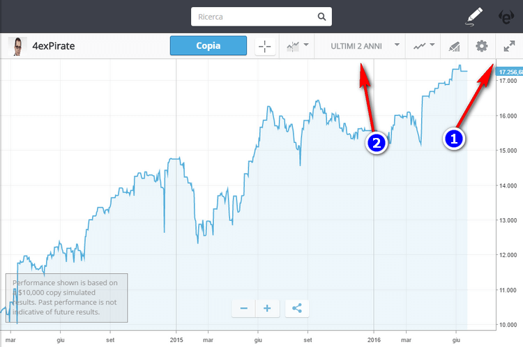 Qui (finalmente) eToro mostra una vera e propria Equity Line dell’andamento del conto del trader (per regole di privacy non mostrano l’ammontare del conto ma è tutto riportato su un ipotetico conto iniziale di 10.000 $).